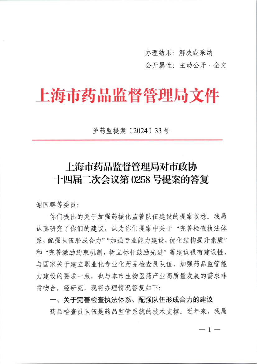 你们提出的关于加强药械化监管队伍建设的提案收悉。我局认真研究了你们的建议,认为你们提案中关于“完善检查执法体系,配强队伍形成合力”“加强专业能力建设,优化结构提升素质”和“完善激励约束机制,树立标杆鼓励先进”等建议很有建设性,与国家关于建立职业化专业化药品检查员队伍、加强药品监管能力建设的要求一致,也与本市生物医药产业高质量发展的需求非常吻合。经研究,现将办理情况答复如下: