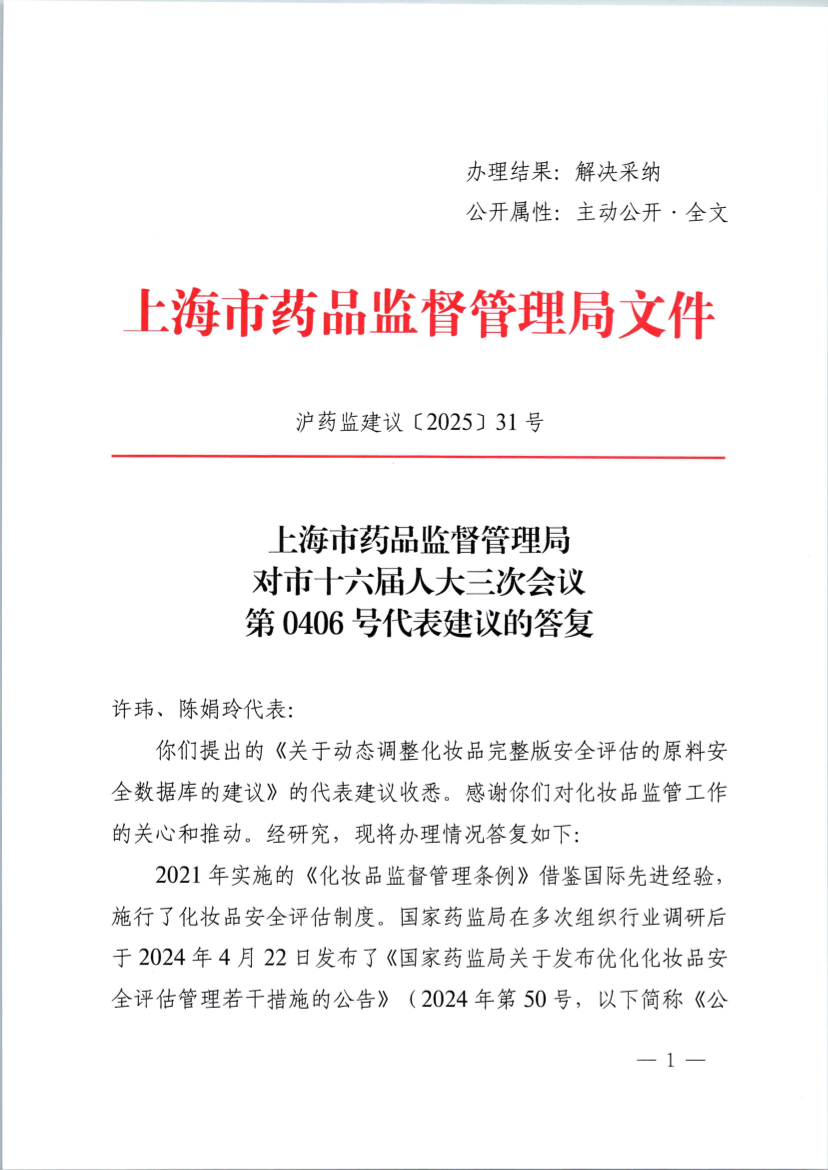 你们提出的《关于动态调整化妆品完整版安全评估的原料安全数据库的建议》的代表建议收悉。感谢你们对化妆品监管工作的关心和推动。经研究,现将办理情况答复如下: