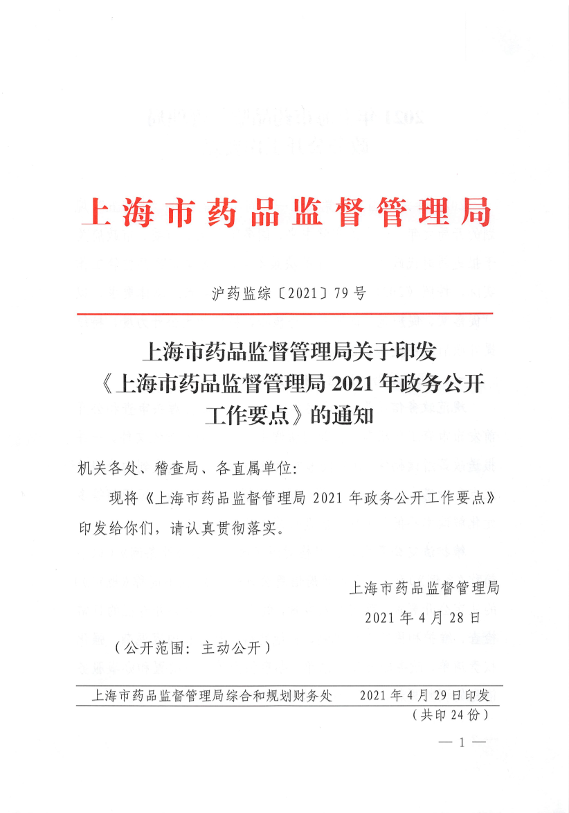 2021年是中国共产党成立一百周年,是实施“十四五”规划的开局之年。认真落实党中央、国务院和上海市委、市政府关于推进新时代政务公开工作的决策部署,结合本市药品监管工作实际,按照《2021年上海市政务公开工作要点》总体要求,以“促落实、促规范、促服务”为核心,持续加大公开力度,持续提升政府透明度和公信力。