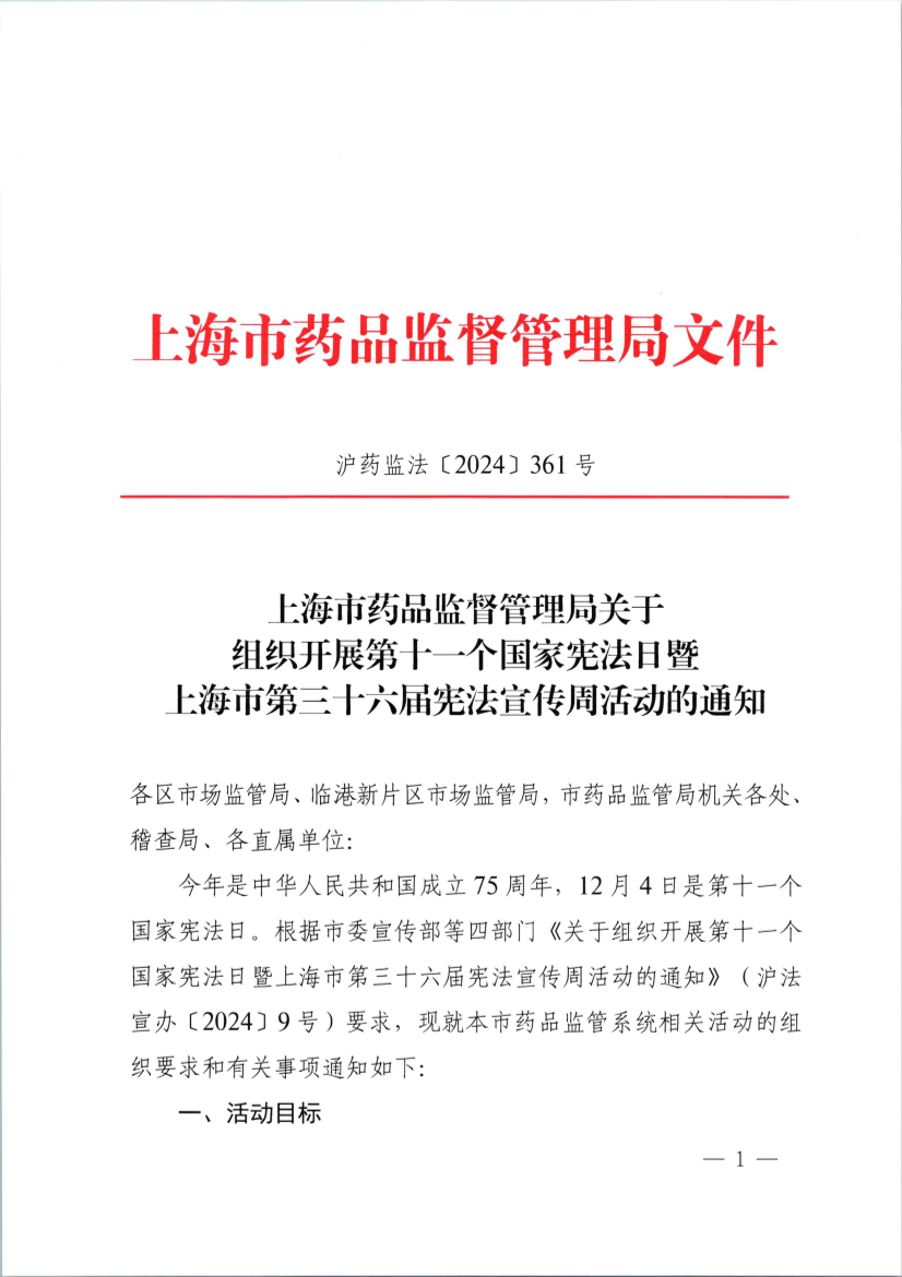 今年是中华人民共和国成立75周年,12月4日是第十一个国家宪法日。根据市委宣传部等四部门《关于组织开展第十一个国家宪法日暨上海市第三十六届宪法宣传周活动的通知》(沪法宣办〔2024〕9号)要求,现就本市药品监管系统相关活动的组织要求和有关事项通知如下: