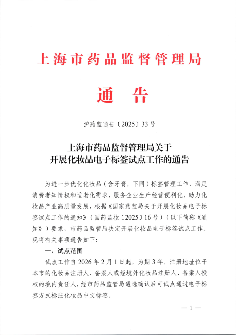 试点工作自2026年2月1日起,为期3年。注册地址位于本市的化妆品注册人、备案人或经境外化妆品注册人、备案人授权的境内责任人,经市药品监管局遴选确认后可试点通过电子标签方式标注化妆品中文标签。