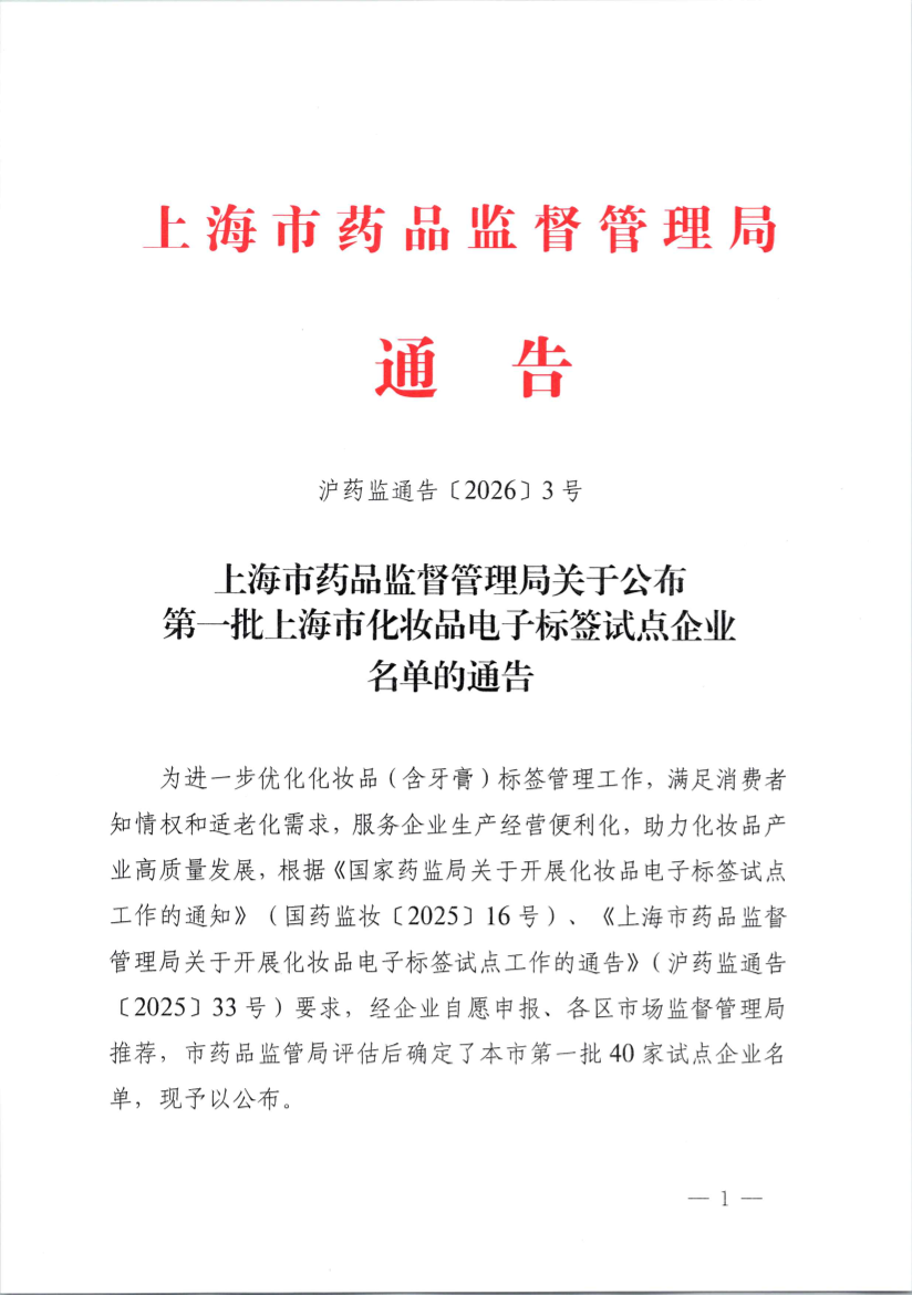 为进一步优化化妆品(含牙膏)标签管理工作,满足消费者知情权和适老化需求,服务企业生产经营便利化,助力化妆品产业高质量发展,根据《918博天堂关于开展化妆品电子标签试点工作的通知》(国药监妆〔2025〕16号)、《918博天堂关于开展化妆品电子标签试点工作的通告》(沪药监通告〔2025〕33号)要求,经企业自愿申报、各区市场监督管理局推荐,市药品监管局评估后确定了本市第一批40家试点企业名单,现予以公布。