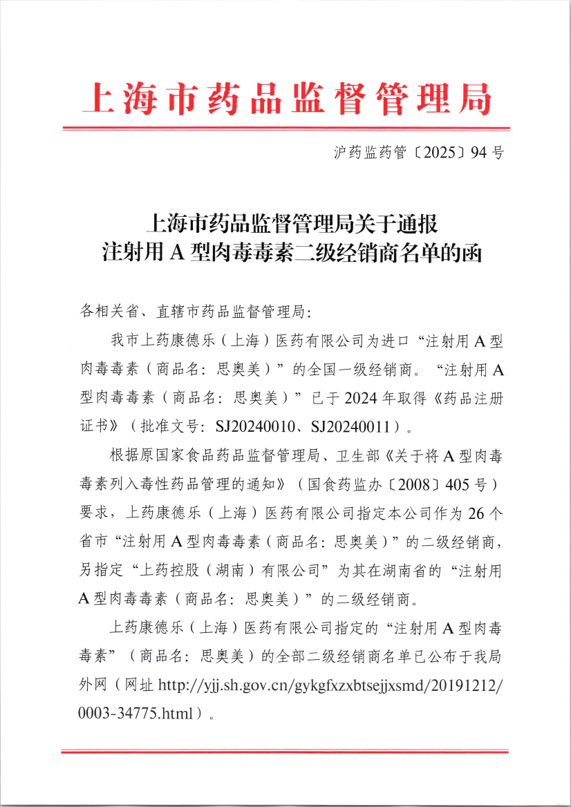 上药康德乐(上海)医药有限公司指定的“注射用A型肉毒毒素”(商品名:思奥美)的全部二级经销商名单已公布于我局外网(网址https://www.ofto.cc/gykgfxzxbtsejjxsmd/20191212/0003-34775.html)。
