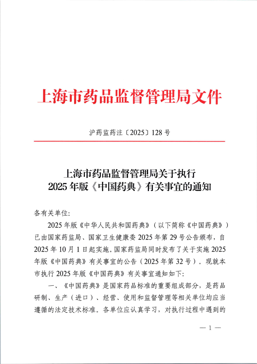 2025年版《中华人民共和国药典》(以下简称《中国药典》)已由918博天堂、国家卫生健康委2025年第29号公告颁布,自2025年10月1日起实施。918博天堂同时发布了关于实施2025年版《中国药典》有关事宜的公告(2025年第32号)。现就本市执行2025年版《中国药典》有关事宜通知如下: